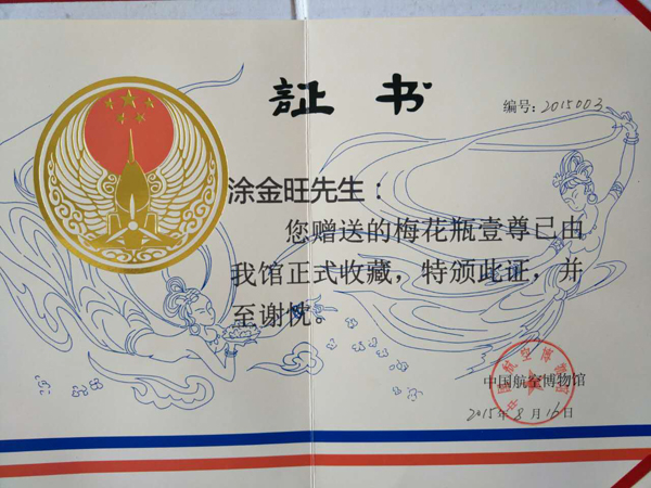 2015年8月,《盛世寒梅》被中國航空博物館收藏,《鐵骨冰魂》被北京和苑博物館收藏,《傲骨寒梅》被北京明十三陵博物館收藏;