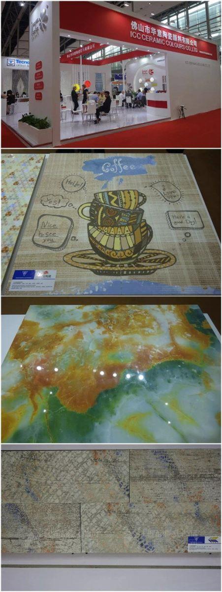 華意與司馬化工,均展出包裹墨水,由于包裹色料飽和度高,包裹墨水發(fā)色純正艷麗,讓瓷磚裝飾效果更富動感張力。紅色、黃色等系列作為常用的包裹顏料墨水,徹底突破傳統(tǒng)墨水發(fā)色或淺或暗、耐溫性差、基礎釉選擇挑剔等使用局限。