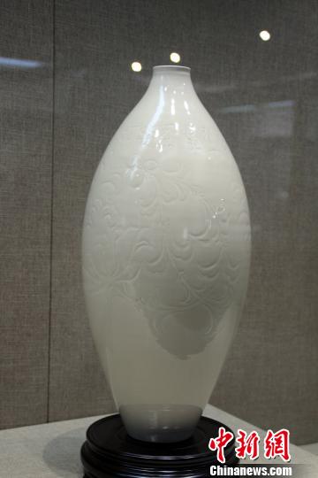 陳文增代表性作品《定窯三聯(lián)藝術(shù)牡丹紋刻花貴妃瓶》!∮诳× 攝