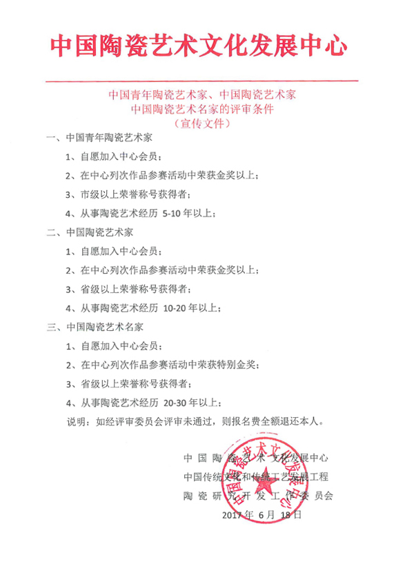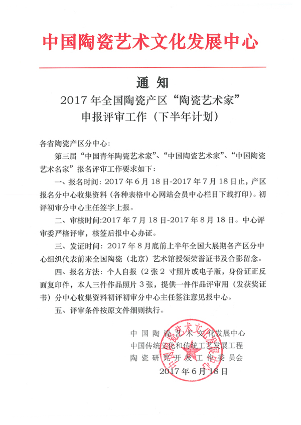 2017年全國陶瓷產(chǎn)區(qū)“陶瓷藝術(shù)家”申報評審工作(下半年計劃)