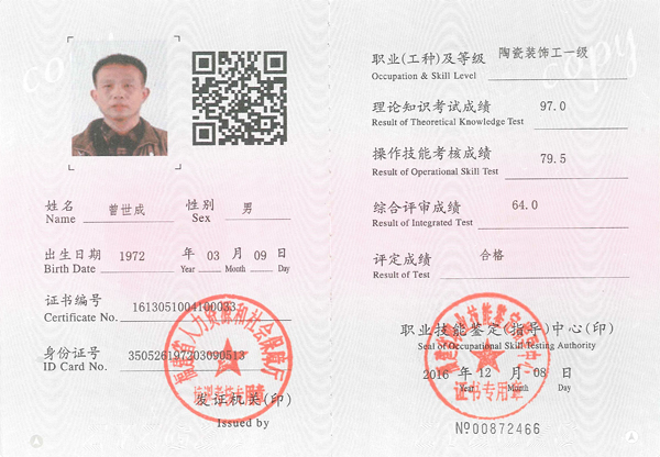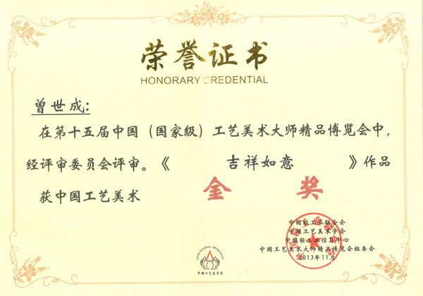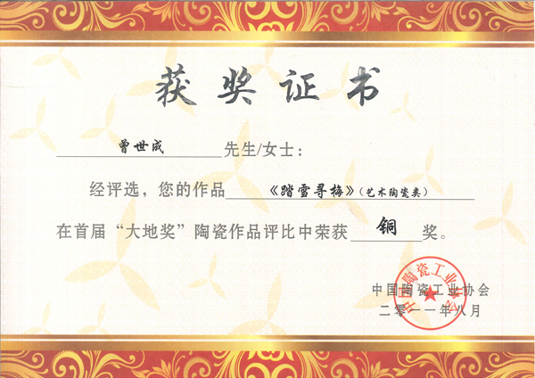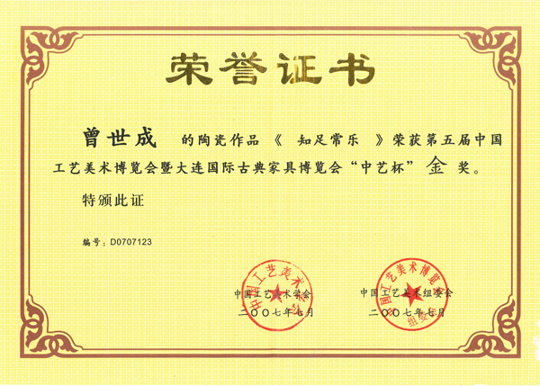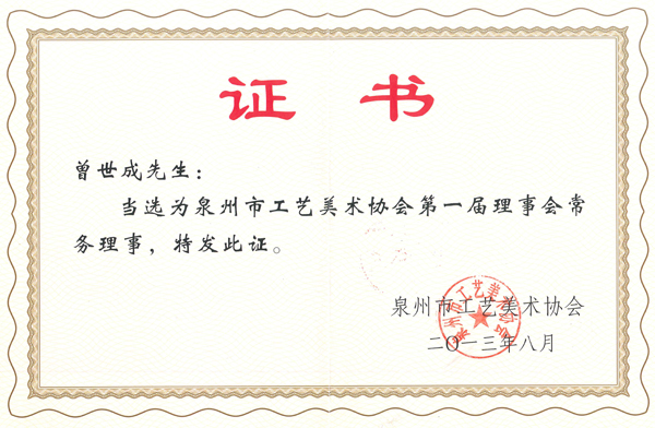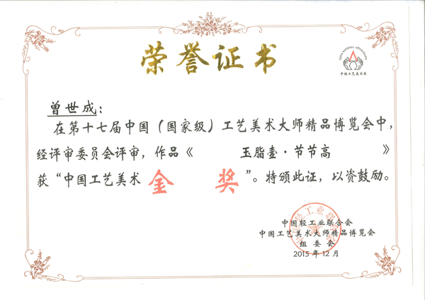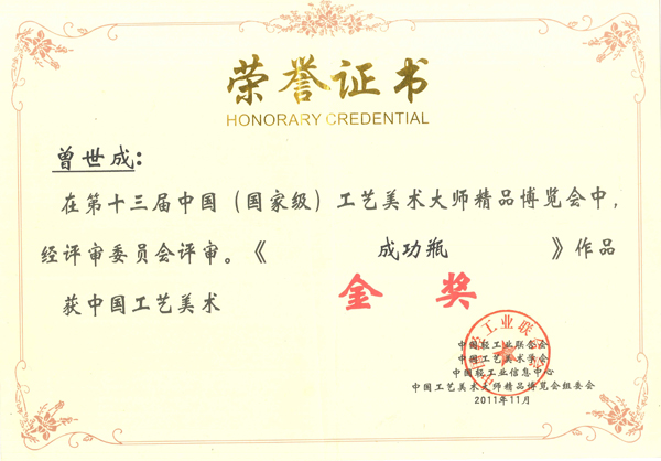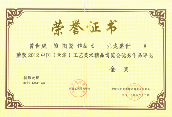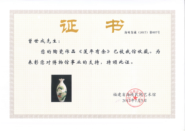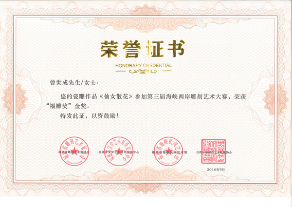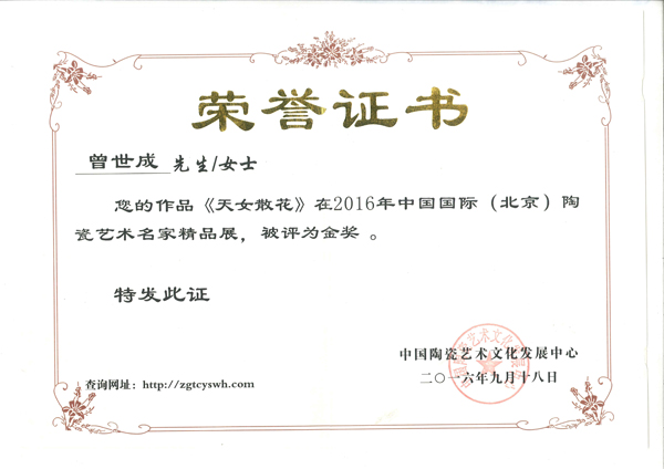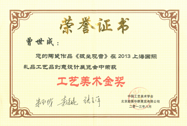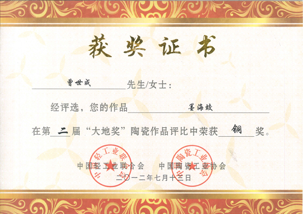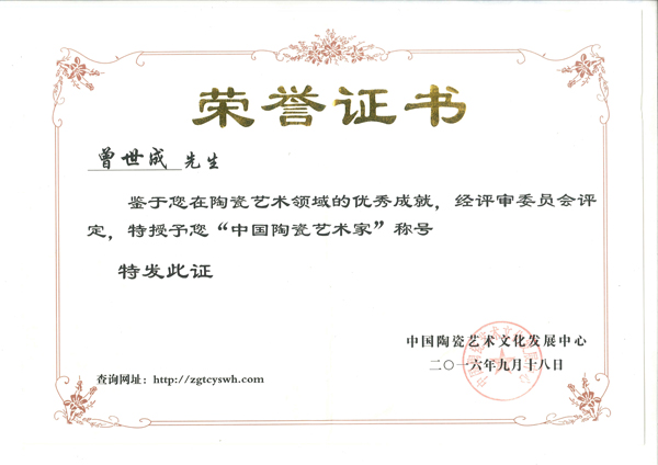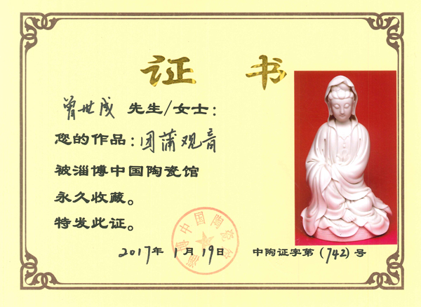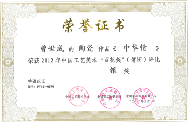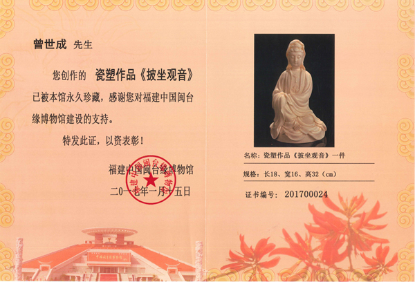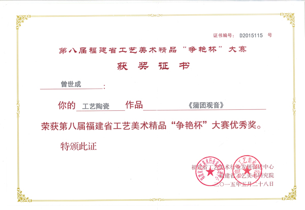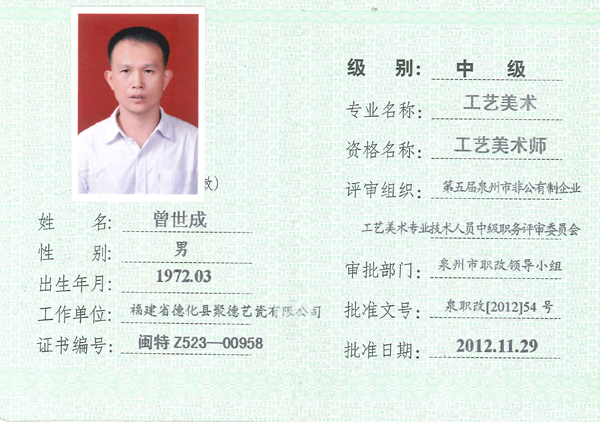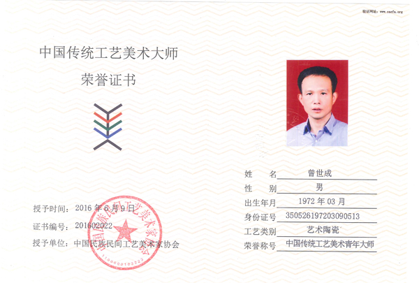 個人簡介: 曾世成、男、漢族、祖籍福建省泉州市德化縣,1972年出生于中國瓷都,德化一陶瓷世家,從小深受陶瓷文化的熏陶。畢業(yè)于景德鎮(zhèn)陶瓷學院,中級工藝美術師,國家一級/高級技師、中國傳統(tǒng)工藝美術青年大師、中國陶瓷藝術家稱號,2006年在北京“中國工藝美術學會高級研修班”進修。其作品屢屢榮獲各種獎項及被多家博物館收藏。