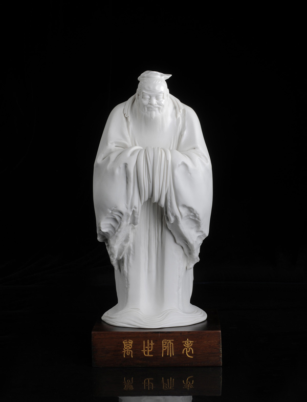 當(dāng)代德化實力派陶藝家鄭志德作品代表作品。作品以德化溫潤如玉的“中國白”為胎質(zhì),手工制作,胎骨潔白,堅實致密,有凝脂似玉之感。孔子身著長袍,面相莊重慈祥、沉靜肅穆。作品工藝精湛,衣紋流暢飄逸,體態(tài)豐隆,把孔子雕刻得活靈活現(xiàn),并與歷史記載中“溫而厲,威而不猛,恭而安”的形象吻合。