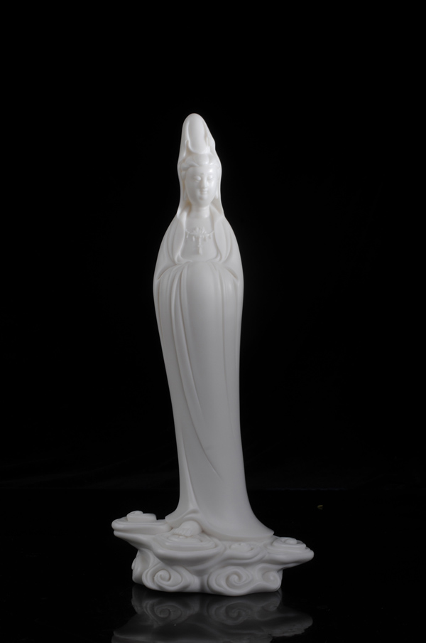 作品光潤潔白,如脂似玉,觀音慈眉善目,臉部神態(tài)極具傳神,手持如意,衣褶深刻,線條圓潤流暢,翻轉自然;造型古樸雅致,形神兼?zhèn),充分表現(xiàn)觀世音菩薩大慈大悲、普度眾生的最高境界。