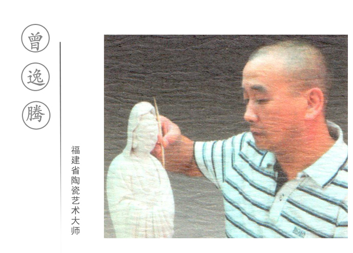 曾逸騰、男、漢族,祖籍福建省泉州市德化縣,1972年出生于中國瓷都,德化一陶瓷世家,從小深受陶瓷文化的熏陶,畢業(yè)于景德鎮(zhèn)陶瓷學院,2006年在北京“中國工藝美術學會高級研修班”。其作品屢屢榮獲各種獎項及被多家博物館收藏。