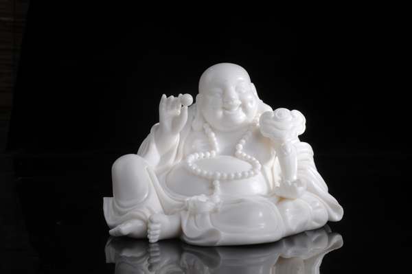 作品彌勒笑看風云戲珠贏,左手輕持如意,寓意事事順意,彌勒笑容可掬,雙耳垂肩。作品采用上等高嶺土經1300多度高溫燒制,將彌勒的形象刻畫得形神兼?zhèn),栩栩如生?/p>