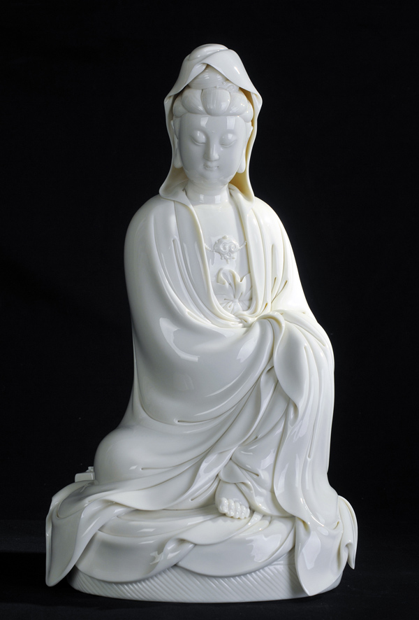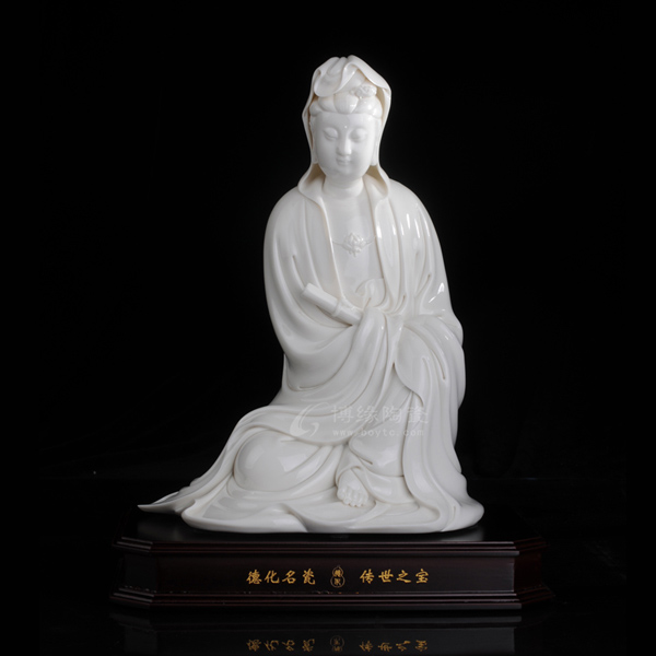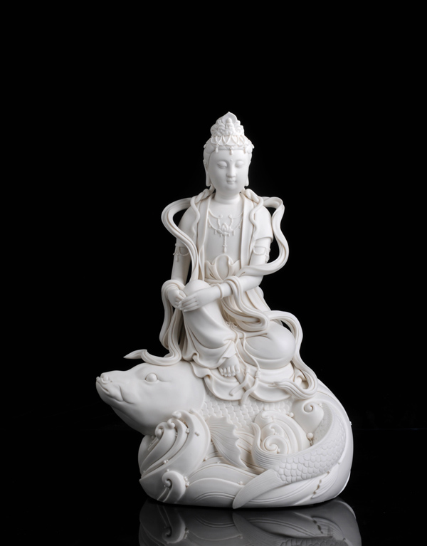 林建平最具代表作品,以德化白瓷為胎質(zhì),圓勁有力如凝脂似玉,滋潤瑩滑。線條清晰、簡潔、瀟灑,多變化,柔媚流暢,翻轉(zhuǎn)自然,觀音雙手藏袖,露一足踏蓮花,另一足水花掩蓋,作踏浪凌波渡海之勢。神情嫻雅平靜,安詳自若,雙目低垂凝思。整座塑像精巧細(xì)致,神態(tài)如生。該作品2013年被永久收藏于福建省非物質(zhì)文化遺產(chǎn)博覽苑。手刻簽名,極具收藏價值。