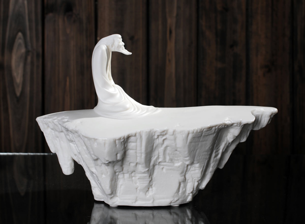 作品中,他創(chuàng)造性地將老者的衣物刻畫得如水般,與高臺(tái)融為一體,作品以德化白瓷為表現(xiàn)形式,素雅自然。