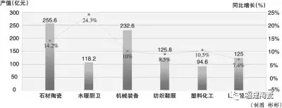 從六大產(chǎn)業(yè)分析來看,1-6月,石材陶瓷產(chǎn)值255.6億元,同比增長(zhǎng)14.2%;水暖廚衛(wèi)產(chǎn)值118.2億元,同比增長(zhǎng)24.3%;機(jī)械裝備產(chǎn)值232.6億元,同比增長(zhǎng)10%;紡織鞋服產(chǎn)值125.8億元,同比增長(zhǎng)8.5%;塑料化工產(chǎn)值94.6億元,同比增長(zhǎng)10.5%;日用輕工產(chǎn)值125億元,同比增長(zhǎng)7.4%。