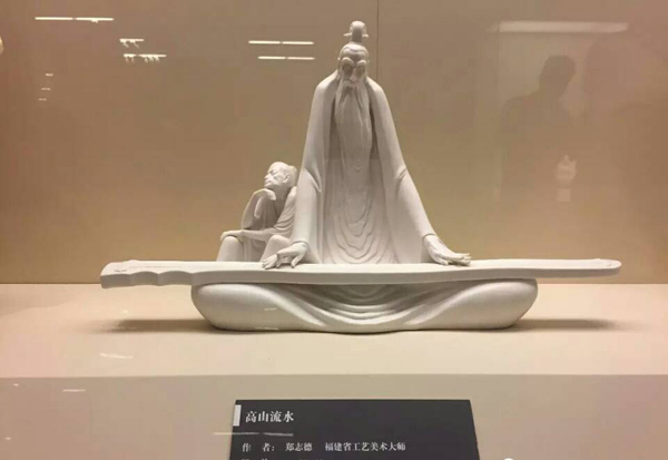 《高山流水》是鄭志德代表作品,作品手刻簽名,作品被評(píng)選為福建省現(xiàn)代陶瓷精品金獎(jiǎng),被福建博物院、韓國江原大學(xué)永久收藏,伯牙端坐撫琴,子期坐在近旁側(cè)耳聆聽。作品著重塑造了伯牙形象,創(chuàng)造性地將其前身置空,長胡須自然下垂,與衣服融合一體,呈現(xiàn)出流水狀態(tài),大膽灑脫,渾樸大氣,三角造型厚重典范,大寫意的手法表現(xiàn)出賢德之人的品德。