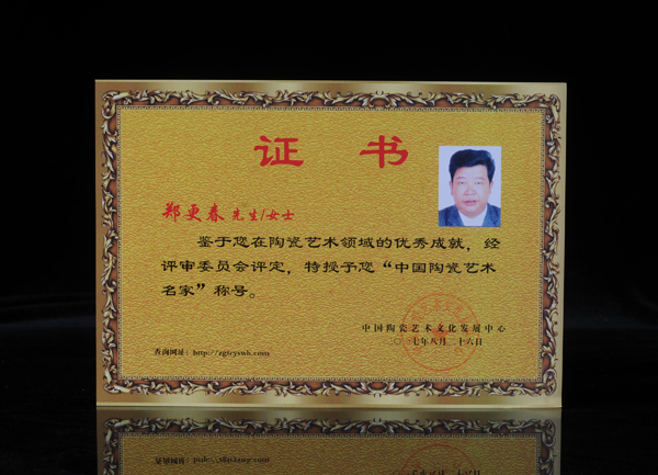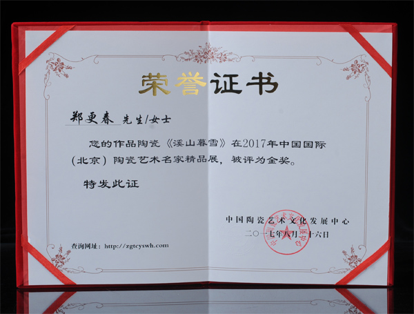 鄭更春從事陶瓷繪畫40多年,主要作品有山水彩繪、花 鳥、走獸等,作品多次獲得國(guó)內(nèi)各評(píng)比大賽金獎(jiǎng),如《招財(cái) 進(jìn)寶》榮獲2008年第十屆中國(guó)名族民間工藝品、旅游紀(jì)念品 、禮品博覽會(huì)金獎(jiǎng);《溪山暮雪》榮獲2017年中國(guó)國(guó)際(北 京)陶瓷藝術(shù)名家精品展作品評(píng)比金獎(jiǎng)等,其作品深受收藏 家及有識(shí)之士青睞,廣受好評(píng)。