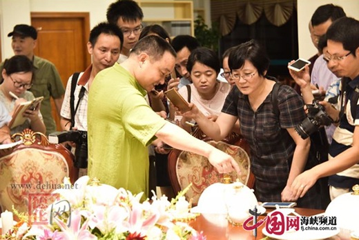 中國(guó)網(wǎng)泉州訊(記者 胡光華 文圖)“哈!哈!哈!”9月14日,中國(guó)白陶瓷藝術(shù)館藝術(shù)總監(jiān)陳仁海一見(jiàn)到“異彩中國(guó)白”新聞采風(fēng)團(tuán)記者們前來(lái),就緊緊握著中共德化縣委常委、宣傳部長(zhǎng)陳堅(jiān)宏的手樂(lè)不可支地開(kāi)心大笑,笑得非常爽朗,他的笑聲緣自該館研發(fā)制作的118套《四海同心》系列國(guó)宴瓷,成功躋身成為金磚國(guó)家領(lǐng)導(dǎo)人廈門(mén)會(huì)晤國(guó)宴餐具。