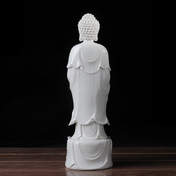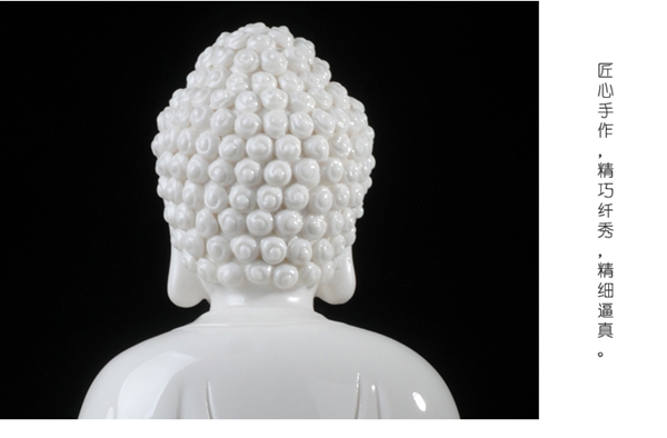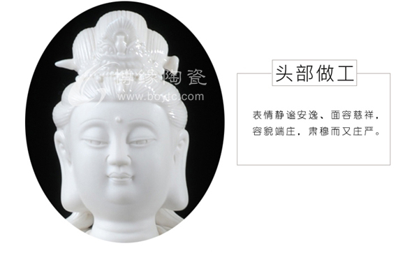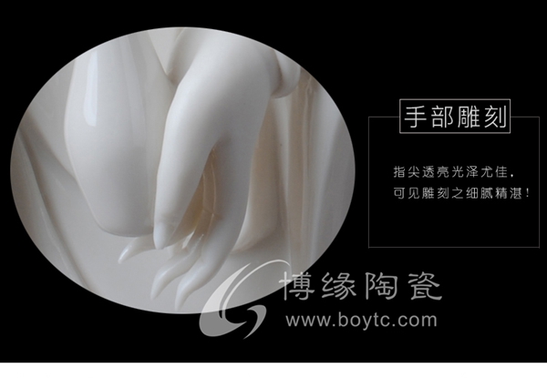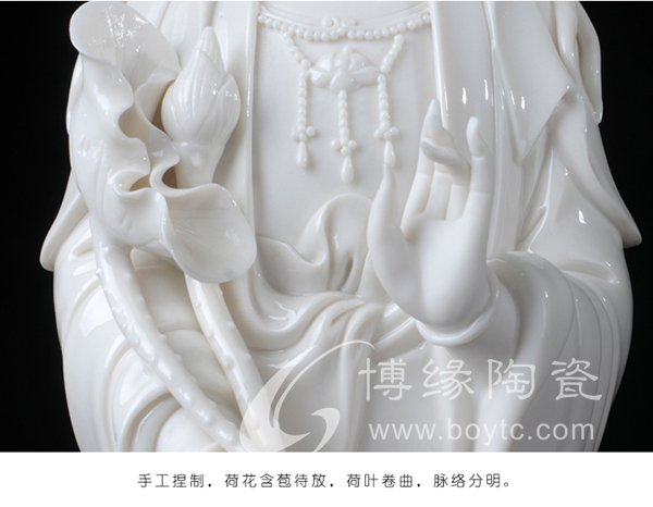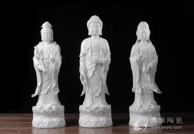 作品西方三圣是以佛教凈土宗崇奉的造像題材,選自優(yōu)質(zhì)白瓷作為塑像材質(zhì),這三尊像皆立于仰蓮座上,各結(jié)不同手印顯示各自不同的宗教功用和身份。佛像下的臺座做成蓮花造型,池中水波蕩漾,盡顯其大愛無疆。