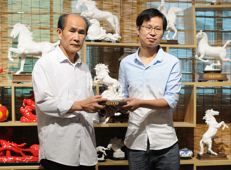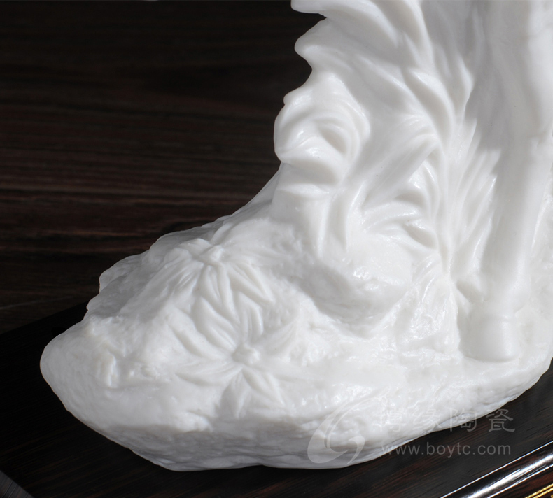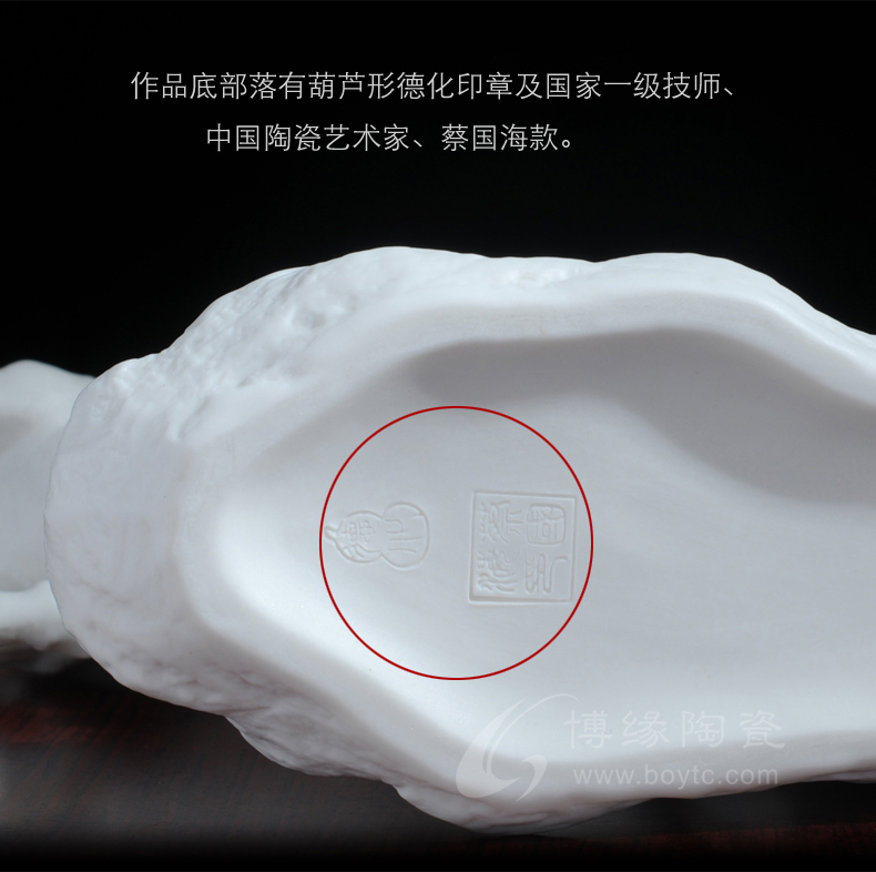 作品精選上乘原礦高嶺土,以德化白瓷為胎質(zhì),經(jīng)堆、雕、捏、貼、塑等手法,歷經(jīng)70多道手工序制作,由1330多度高溫?zé)贫伞?/p>