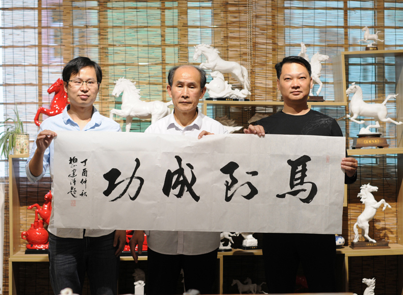 中國(guó)書畫學(xué)會(huì)副主席、中國(guó)書畫非物質(zhì)文化遺產(chǎn)功勛人物——賴建清為作品題詞“馬到成功”。(圖中:書法家賴建清、左:總經(jīng)理柯維太、右:作品藝術(shù)總監(jiān)蔡國(guó)海)