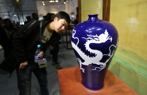 游客觀看皇窯展廳元代祭藍(lán)釉刻白龍紋梅瓶(王東攝)