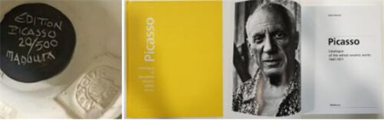 常見的底款 每一件畢加索陶瓷上,都留有底款和標(biāo)記。有些作品底部有印章或記號,有些則在作品背面。在某些容器作品上,底款甚至在作品內(nèi)部。這些底款在不同系列中表現(xiàn)形式有不同,隨著年代推進(jìn),底款在形式上也有變化。 最常見的畢加索陶瓷底款一般寫著有如“Madoura Plein Feu”,“Edition Picasso”,“Empreinte Originale de Picasso”和“d’Après Picasso”的字樣。所有這樣的標(biāo)記都表明作品是畢加索限量陶瓷原作。 2.畢加索陶瓷圖錄 畢加索陶瓷圖錄上清晰的記載了每件作品的“創(chuàng)作年份”。 這個年份標(biāo)記了畢加索最初創(chuàng)作這款陶瓷的年份,但有可能并不是此款所有作品實際被制作出來的年份。 3.授權(quán)書 畢加索館藏級陶瓷作品證書由蘇富比、佳士得御用畢加索陶瓷專家——喬納森·納什先生鑒定后出具的證書具有學(xué)術(shù)上的權(quán)威性。 (曾任倫敦蘇富比,佳士得拍賣有限公司“畢加索陶瓷專場”資深顧問,F(xiàn)為美國LC藝?yán)犬吋铀魈沾刹块T的研究專家。 1968年,喬納森隨父母移居法國南部蔚藍(lán)海岸的安提比斯,在那個時候,畢加索因為西班牙的內(nèi)戰(zhàn)和其他幾個藝術(shù)家移居到安提比斯,并在當(dāng)?shù)氐鸟R杜拉陶瓷坊研究制陶工藝。)
