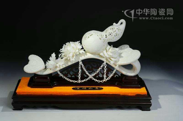蘇志強(qiáng)的作品《圓滿(mǎn)如意》就是揉合中華傳統(tǒng)文化的元素,以如意棒為主體,圓球代表圓滿(mǎn),蘊(yùn)含著“萬(wàn)事如意”、“美美滿(mǎn)滿(mǎn)”的美好意象。作品純手工制作,精雕細(xì)刻,造型和諧,用璀璨的瓷花襯托柔軟鏈條的動(dòng)感,剛?cè)嵯酀?jì),松密結(jié)合,令人賞心悅目。作品并以德化特有的溫潤(rùn)如玉的“中國(guó)白”為胎質(zhì),潔白細(xì)膩,素凈淡雅。