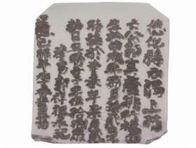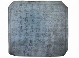圖1,明正德十四年郭真蔭墓志銘,高14.1厘米,寬12.8厘米,厚5厘米。瓷版墓志銘長方形,上部兩旁斜角。面施白釉,青料銘文:“德化縣西隅上林,亡公郭真蔭……正德己卯年季春吉日書”等63字,記載著逝者墓地名、生卒年月。字跡青料淺淡,藍中閃灰并夾有褐色。白胎質(zhì)地細膩堅致。志主郭真蔭與銘文作者郭祥祖均未見經(jīng)傳,事歷不詳。此銘為目前德化發(fā)現(xiàn)的最早瓷版墓志銘。