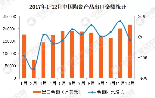 據中商產業(yè)研究院發(fā)布的《2018-2023年中國陶瓷產品市場前景及投資機會研究報告》數據統(tǒng)計顯示,2017年12月中國陶瓷產品出口金額2159649千美元,同比減少3.2%;1-12月,中國出口陶瓷產品金額19249612千美元,同比增長5.4%。