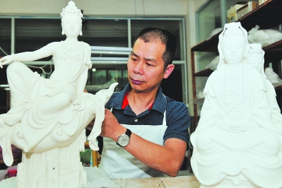 在德化冠福窯禮瓷有限責(zé)任公司,一件件瓷質(zhì)潔白、純凈通透的瓷塑作品,在燈光照射下,更顯光潤明亮、栩栩如生。