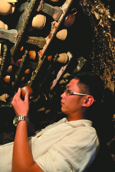 德化洞上陶藝村月記窯內(nèi),一名創(chuàng)業(yè)大學(xué)生在查看柴燒作品。