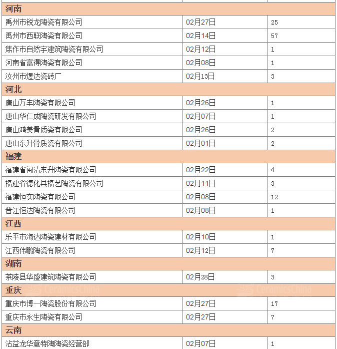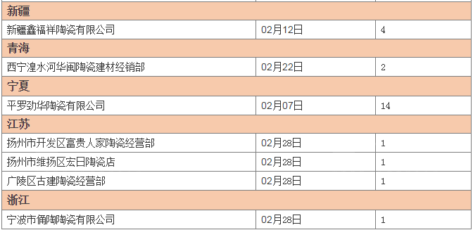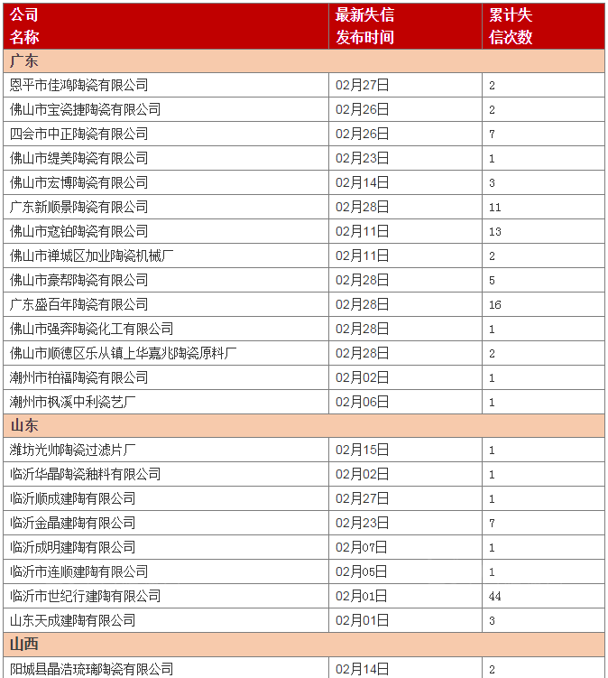 3月1日,記者根據(jù)最高人民法院及各地法院發(fā)布的失信被執(zhí)行人信息統(tǒng)計,2018年2月份有40余家陶企被列入“失信被執(zhí)行人名單”。據(jù)悉,2月份的名單涉及15個。ㄊ校瑥V東省失信陶企最多,高達14家。