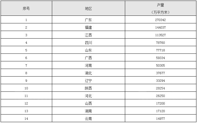 在全國各建陶產區(qū)中,2017年陶瓷磚產量排名前十四的依次為廣東、福建、江西、山東、四川、廣西、河南、湖北、遼寧、陜西、河北、山西、湖南、云南(詳見表2)。