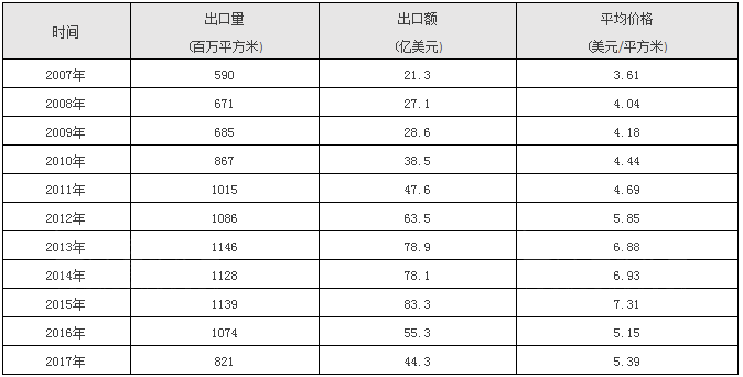 表3:2007年-2017年全國陶瓷磚出口統計
