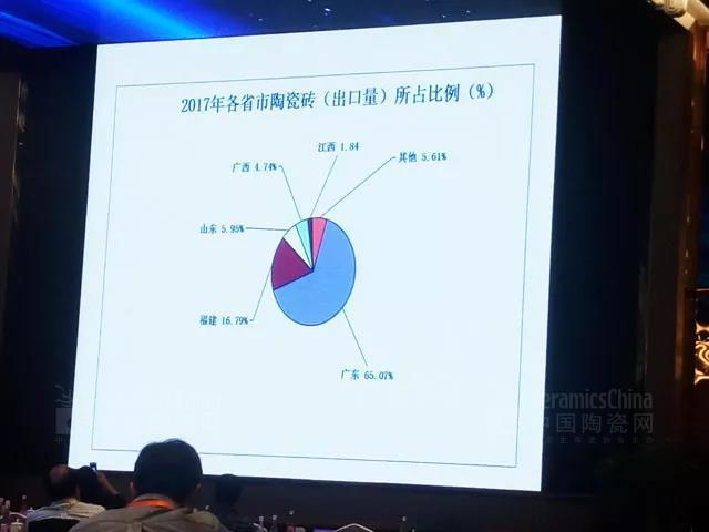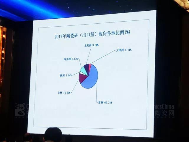 從2017年陶瓷磚(出口量)流向各地的比例來看,依次為:亞洲60.31%,非洲14.59%,北美洲9.3%,南美洲8.63%,大洋洲4.11%,歐洲3.04%。