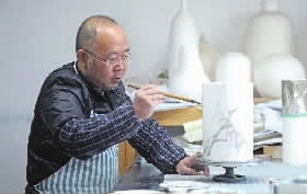 在位于醴陵瓷谷的醴泉窯藝公司里,陽光透過窗戶溫暖著整個工作室。室內(nèi),釉下五彩手工藝人黃彪神情專注在瓷板上。他時而駐足冥思,時而調(diào)色運(yùn)筆,一會兒工夫,鮮艷的畫面在瓷板上慢慢地呈現(xiàn)出來。