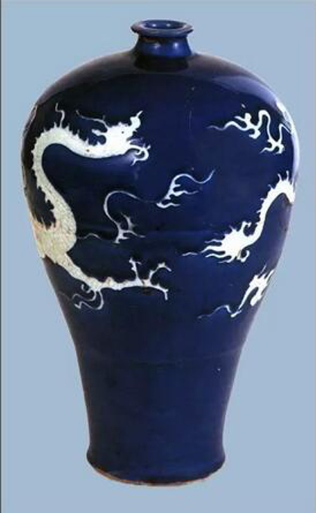 高溫鈷藍(lán)釉瓷器是以鈷作為著色元素,元代創(chuàng)燒的新品種,為明、清祭(霽)藍(lán)、灑藍(lán)等藍(lán)釉瓷器奠定了基礎(chǔ)。裝飾上或飾以描金,或飾以白龍、白鳳等紋飾,兼以刻、劃花工藝。傳世有梅瓶、盤(pán)、匜等器型。