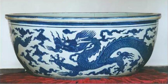 綜合史料上的分析,正統(tǒng)時(shí)期燒造的龍缸很有可能是為防火患的消防水缸,也有說(shuō)法為養(yǎng)荷、養(yǎng)魚(yú)之用。頤和園收藏的此件龍缸年代也符合正統(tǒng)燒造龍缸的時(shí)代背景。燒造大口徑的龍缸難度極大,即使到了明代晚期也不易燒造,曾出現(xiàn)過(guò)萬(wàn)歷二十七年景德鎮(zhèn)御窯廠窯工童賓被逼燒造龍缸未成,而殉窯的事件,可見(jiàn)其燒造難度之大。目前資料未見(jiàn)明代有超過(guò)94厘米口徑龍缸的記述,頤和園收藏的明代早期青花云龍紋缸有著極高的學(xué)術(shù)研究?jī)r(jià)值,可謂撼世之寶,龍缸之王。
