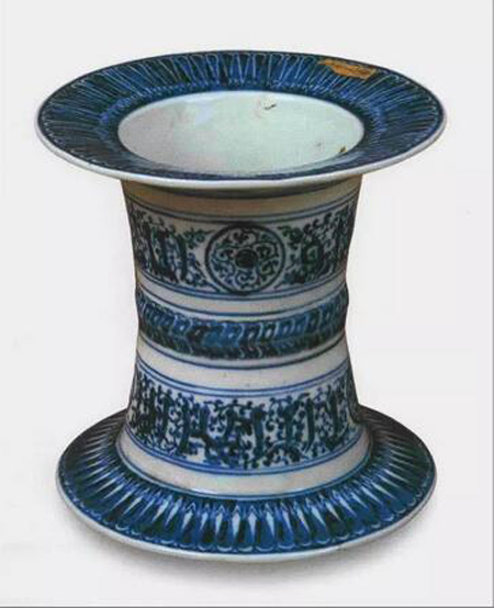 永樂(lè)青花無(wú)擋尊,口徑17.2厘米,底徑17厘米,高17厘米。尊身中空為筒狀,上、下口部寬折沿。器物整體紋飾布局,呈帶狀裝飾,口和底沿飾以菊瓣紋;尊身上、下繪以纏枝、團(tuán)形圖案及阿拉伯文;中間飾以仰、覆蓮瓣紋。永樂(lè)、宣德官窯青花瓷器使用進(jìn)口的蘇麻離青,青花發(fā)色鮮艷古樸,有暈散效果,鐵銹斑痕跡明顯,而此器亦同。無(wú)擋尊是仿阿拉伯銅器造型制作,乾隆皇帝曾作有兩篇《詠宣德窯無(wú)擋尊》詩(shī)文,其一: