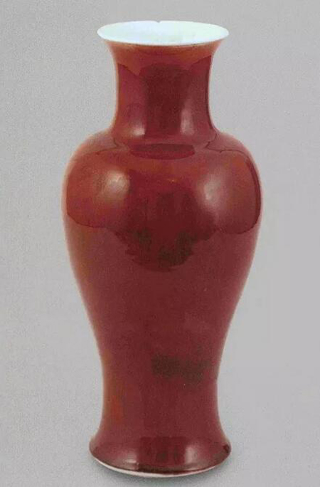 郎窯紅釉是康熙晚期景德鎮(zhèn)仿燒明代永樂(lè)、宣德時(shí)期鮮紅釉瓷器而產(chǎn)生紅釉新品種?滴跛氖哪曛廖迨荒辏餮矒峒婢暗骆(zhèn)御窯廠督理主持窯務(wù),由于清代官窯瓷器常以督陶官姓氏冠以窯名,所以在郎廷極為督陶官期間創(chuàng)燒的紅釉新品種,稱為郎窯紅釉。郎窯紅釉瓷器,以氧化銅為著色劑,生坯掛釉,入窯經(jīng)1300℃高溫再還原氣氛中一次燒成。郎窯紅釉瓷器造型以瓶、尊為主,尤以觀音尊最有特色,釉色鮮紅,顏色隨垂流逐漸加深,釉面清亮,玻璃質(zhì)感較強(qiáng),釉面有開(kāi)片、鬃眼和牛毛細(xì)紋,口部釉薄露出胎骨白色,紅釉垂流通常不過(guò)底足,有“脫口垂足郎不流”之說(shuō),底足為“米湯底”或“蘋(píng)果綠底”,偶見(jiàn)紅釉底,一般不署款識(shí)。