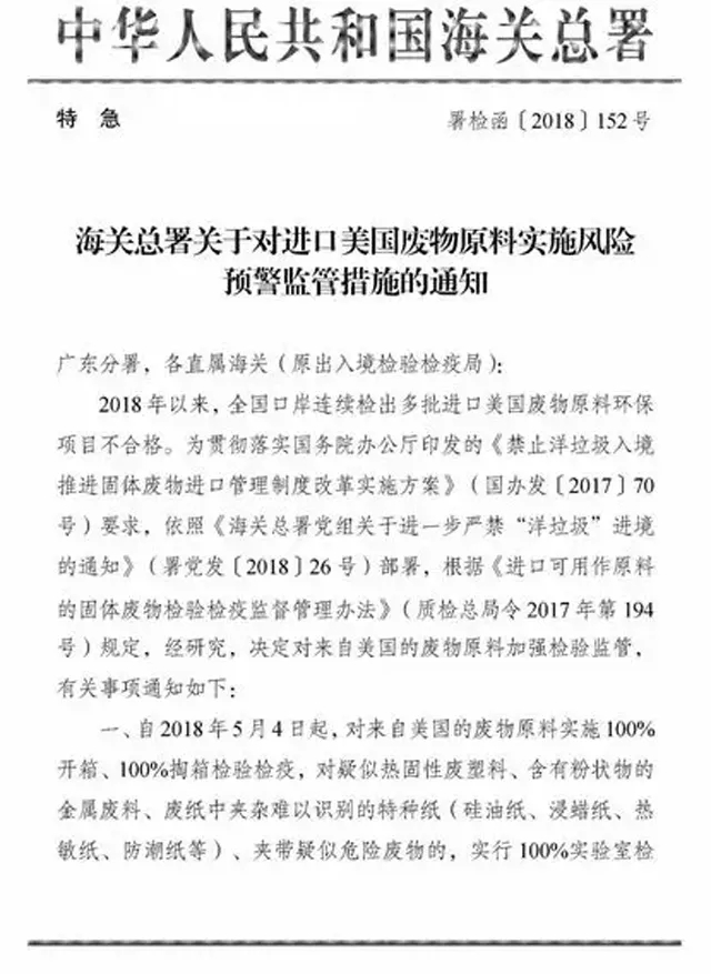 ▲海關(guān)總署發(fā)布特急文件,要求加強(qiáng)美國進(jìn)口固廢監(jiān)管。