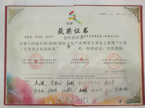記者昨日從深圳文博會組委會了解到,由廣東大埔縣怡豐園公司選送的青花骨質瓷“聚寶盆”《清明上河圖》,在第十四屆深圳文博會上獲得“中國工藝美術文化創(chuàng)意獎”金獎。