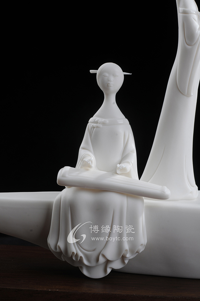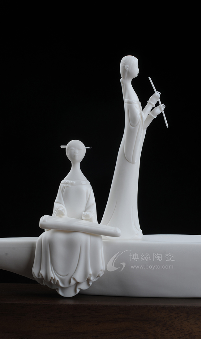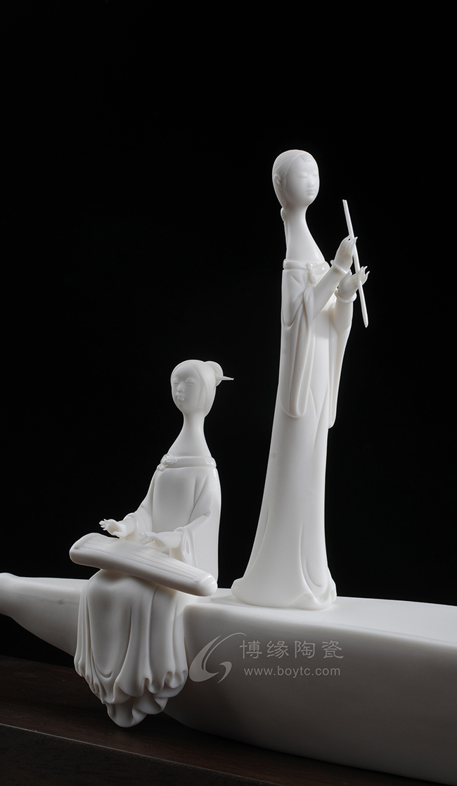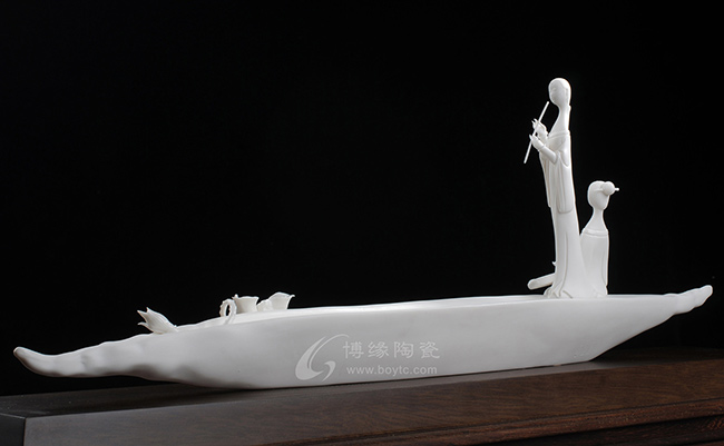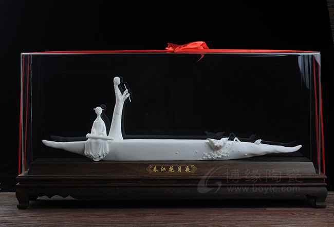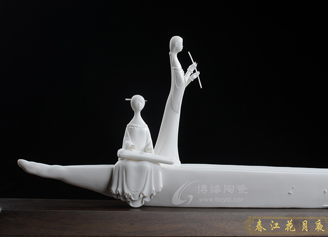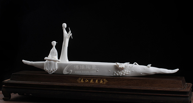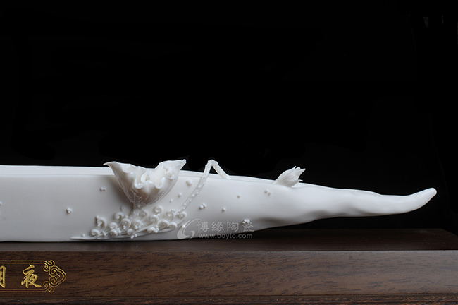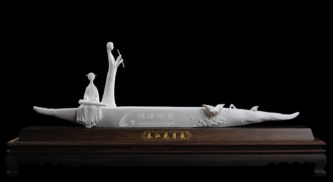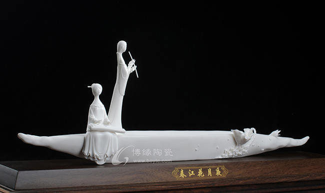 作品《春江花月夜》帶著濃濃的古典詩(shī)情意境,作者用白瓷藝術(shù)勾勒出一幅春江月夜的壯麗畫面:江潮連海,月共潮生,泛舟春江上,一曲長(zhǎng)笛聲悠悠。