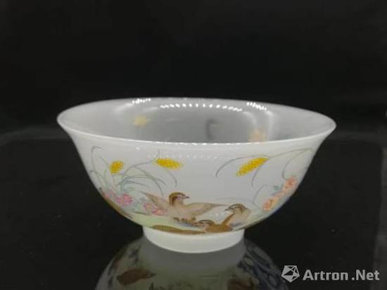2017年10月以天津博物館清乾隆款雉雞芍藥玉壺春瓶圖案紋飾為參考,制作出冰瓷琺瑯雉雞芍藥宮碗,在天津博物館一樓陳列展出。