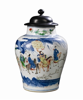 此罐(見(jiàn)圖)高33厘米,胎體厚重,圓唇直口,直頸,豐肩,鼓腹,平底無(wú)釉。胎質(zhì)細(xì)密堅(jiān)硬,釉面肥潤(rùn)而略顯青色。通體以青花五彩裝飾,人物繪畫(huà)細(xì)膩,神態(tài)各異;人物勾線、設(shè)色,以及山石樹(shù)木的布局和勾畫(huà)皴染等,具有典型的清早期風(fēng)格,為早期的民窯作品。