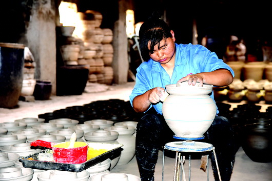 游覽區(qū)與生產(chǎn)區(qū)由一條巷道分離,自然地呈現(xiàn)為兩個空間。高大的彩鋼房制陶車間,身著灰色工裝的師傅,嫻熟操控飛速旋轉(zhuǎn)的制陶機,一團陶泥不可思議地變身,灰色的陶缸逐漸占領(lǐng)地面,陶工心里默默計算著一天的收獲;在另一處上釉車間,房屋低矮、光線灰暗,無數(shù)陶缸粗暴地擠滿空間,卻遮擋不住一抹明亮的色彩在車間內(nèi)跳躍——一個6歲的孩童正在幫媽媽搬運陶罐,遠(yuǎn)處孩子們歡聲笑語飄蕩而來,似乎不曾擾亂他幼小的心智,嬌小敏捷的身姿不停游走,源源不斷為母親上釉提供陶罐,母親愛憐地提醒他歇息,孩童反倒更加專注迅捷,讓人忍俊不禁、其樂融融,或許她們在勞作中看到了精美的文具和童裝,還有母子收工回家的歡愉。