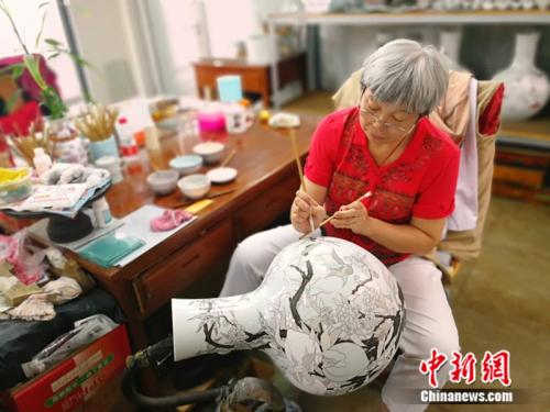 李桂榮在給瓷瓶填色。