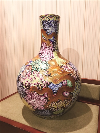 乾隆琺瑯彩菊花龍紋天球瓶。瓶高55cm,瓶口直徑11.5cm,瓶底直徑19cm。天球瓶是受西亞文化影響極深的一種造型,為宮廷大型陳設用瓷,始于明代永樂、宣德年間,盛行于雍正、乾隆年間,圓口、直頸、狀若天球,故名天球瓶。