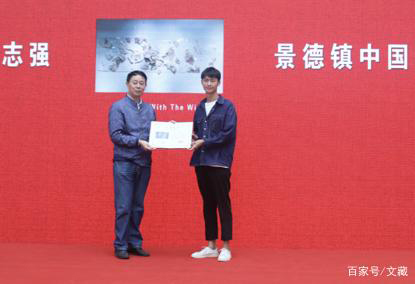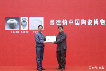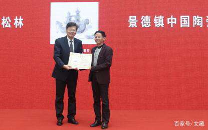 (景德鎮(zhèn)市文廣新旅局黨組成員、景德鎮(zhèn)中國(guó)陶瓷博物館館長(zhǎng)趙綱為劉松林先生頒發(fā)證書(shū))