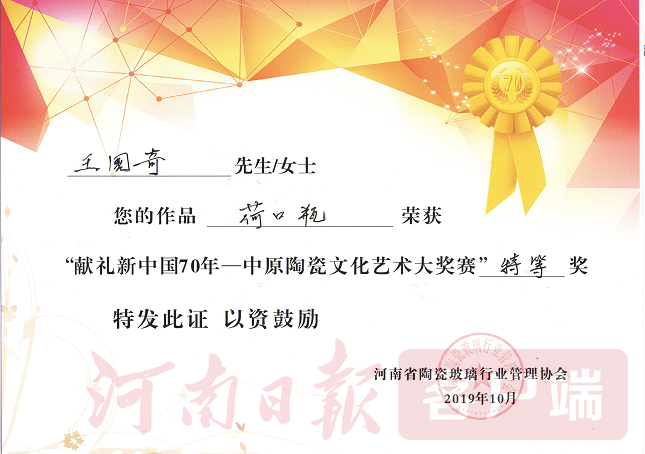 河南眾多陶瓷藝人中,款款走來了又一位大家。近日,在鄭州國際會(huì)展中心舉辦的“獻(xiàn)禮新中國70年·中原陶瓷文化藝術(shù)大獎(jiǎng)賽”上,汝窯復(fù)燒第一人王國奇再獲新榮譽(yù),被評選為“中原人最喜愛的陶瓷藝術(shù)家”。