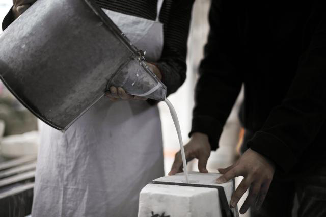 11月12日,在福建德化明華陶瓷藝術(shù)研究所,陳明華(左)和兒子張國暉在向模具灌漿,凝固成型后就可以進行燒制。