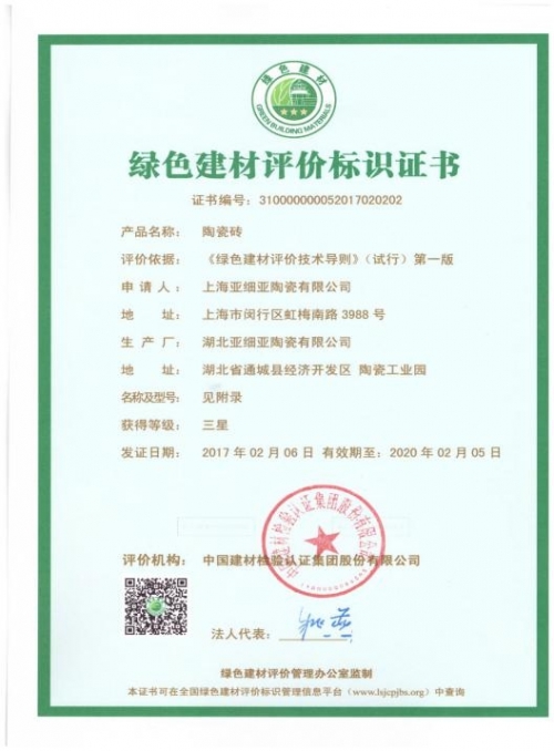 三**綠色建材標(biāo)識(shí)為綠色建材的**等級(jí),素以審核條件嚴(yán)苛、環(huán)保排放要求高著稱,亞細(xì)亞瓷磚榮獲最 高 級(jí)別三**綠色建材評(píng)價(jià)標(biāo)識(shí),可見(jiàn)其在環(huán)保領(lǐng)域的投入與領(lǐng) 先。