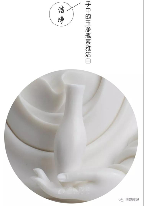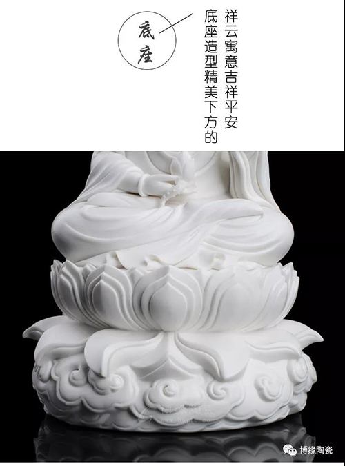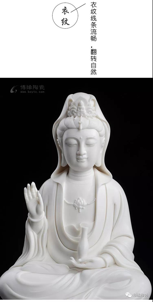 《坐蓮觀世音菩薩》以徳化白瓷カ胎貭,觀音坐于蓮花之上,左手持瓶,圜劭有カ如凝脂似玉,滋洞萓滑。銭條清晰、筒浩、瀟灑,多変化,柔媚流暢,翻裝自然,神情嫻雅平靜,安洋自若,雙目低垂凝思。面部刻刻細膩,衣紋則深而洗蘇,主次分明,作品結(jié)合古典及現(xiàn)代家居美一體。