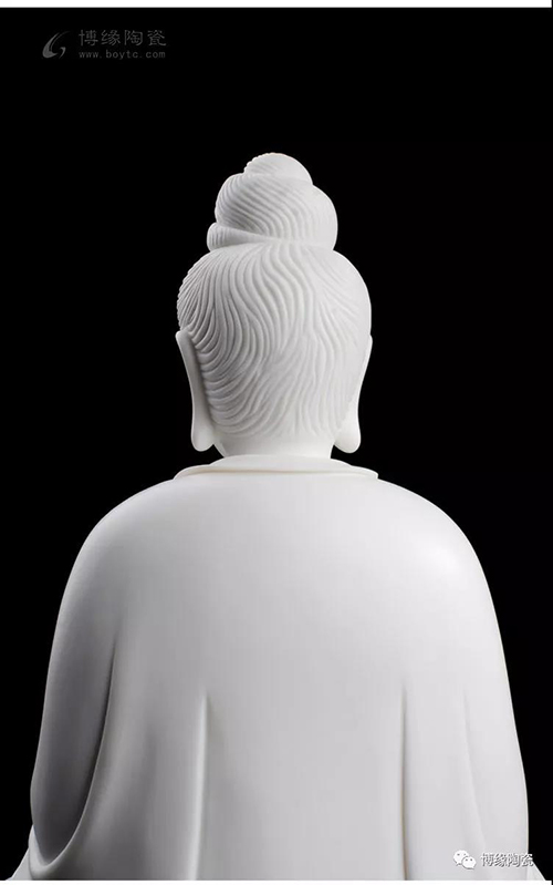 早在明代德化白瓷佛像就名聲在外,一代“瓷圣”何朝宗佛像名作流傳后世,成為世界各大博物館收藏的珍品,更對佛像雕塑史上產(chǎn)生深遠的影響,形成“何派”雕塑,其開創(chuàng)的捏、塑、雕、刻、刮、削、接、貼八字技法延用至今。何派雕塑注重于細節(jié)之美,精益求精,故而十分著意衣紋的刻畫,使線條流暢,翻轉(zhuǎn)自然。觀其佛像,仿佛有春風(fēng)拂面,衣袂飄揚的出塵之感。