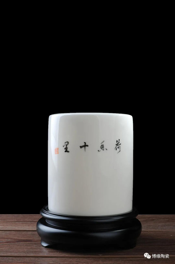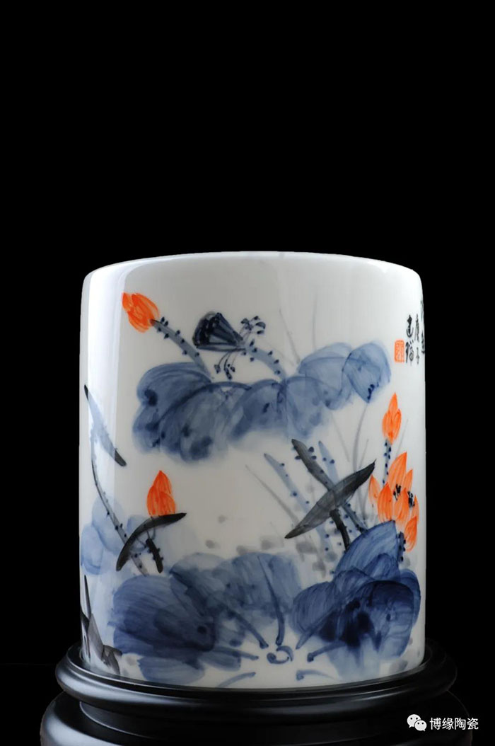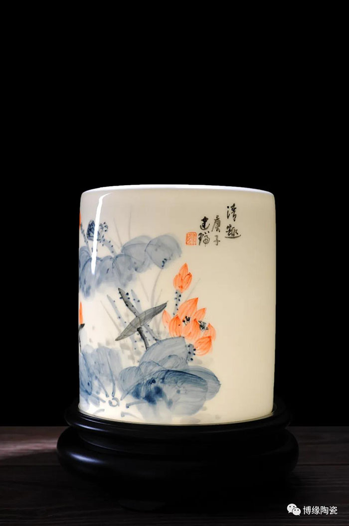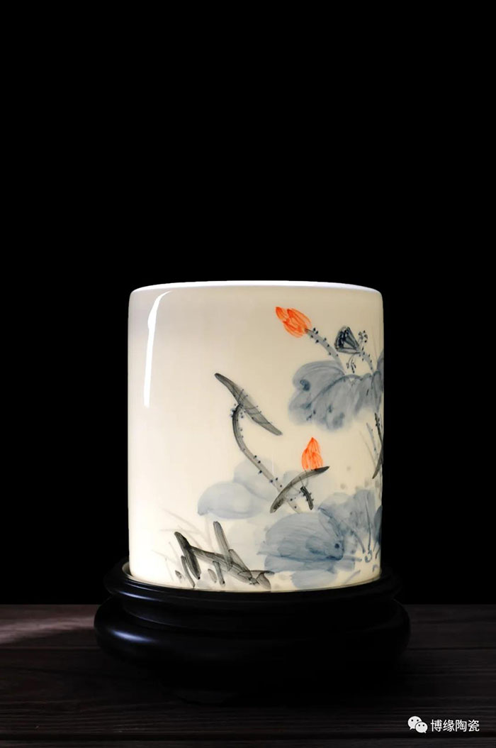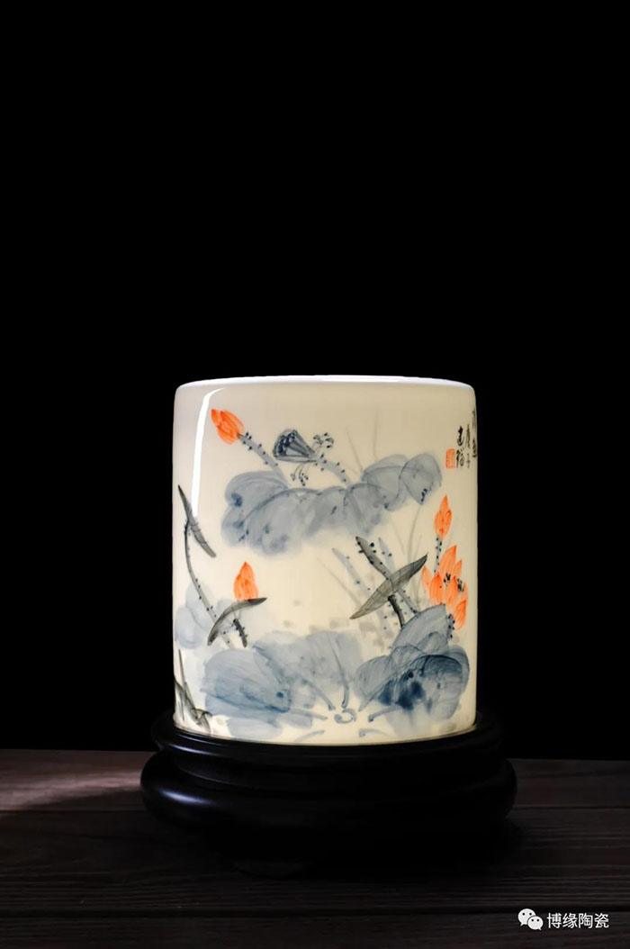 筆筒的制作除了材質(zhì)的不同,繪畫技法也得到了充分的體現(xiàn)。二十世紀(jì)初期,江西景德鎮(zhèn)的瓷畫藝人對傳統(tǒng)粉彩畫法加以改造,用粉彩原料在瓷器上繪制中國畫,形成了以“珠山八友”為代表的瓷繪名家流派
