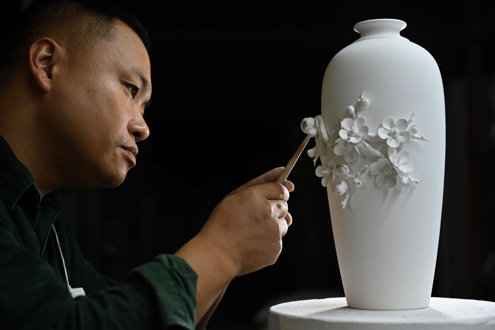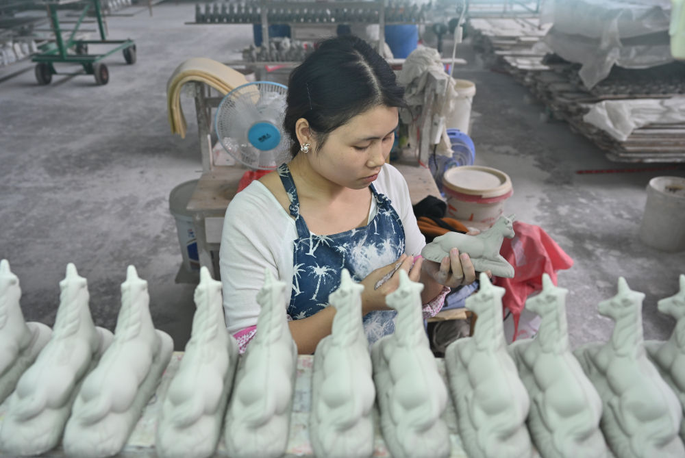 10月21日,在福建省泉州市德化縣順美陶瓷廠,工人制作出口歐美的陶瓷工藝品。